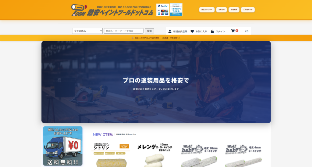 豊富な商品カテゴリには、刷毛(ハケ)、塗装ローラー、マスカー・養生用品、マスキングテープ、塗装工具・機器、バケットやネットなどの塗装関連用品が揃っています。多種多様なサイズ・用途の商品を「格安」で提供し、税込16,500円以上の購入で送料無料(※北海道・沖縄除く)などお得なサービスもあります。